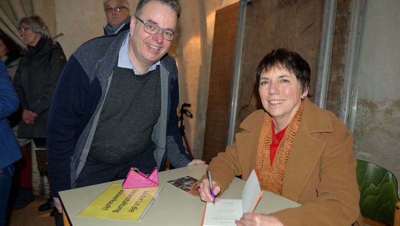 Die Theologin erzählt lebhaft und mit einem Augenzwinkern und nimmt sich am Ende trotz aller Geschäftsmäßigkeit ihres Auftritts die Zeit, Bücher zu signieren.