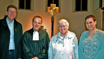 Meditative und stärkende Lieder gaben Raum, zur Ruhe zu kommen. „Worauf können wir uns verlassen in den Verwandlungen unserer Zeit?“, fragte Pfarrer Dr. Marcel Freitag, der im Rahmen dieses Gottesdienstes aus seinem Probedienst im Kirchenkreis Tecklenburg verabschiedet wurde. „Den Grund unseres Lebens und den Mut, über den reißenden Fluss in eine neue Zukunft zu gehen, das feiern wir heute am Reformationstag“. Gott sei ein Mutgeber. Dies kam auch in den Versen aus Psalm 46 zum Ausdruck, die er gemeinsam mit Maria Freese im Wechsel vortrug.