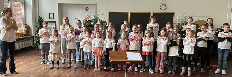 Beeindruckend war, wie die Kinder beim Stück „Bim bam bim bam“ Bewegungen und Text zusammenführten. Viele Lacher gab es bei dem Lied „Uwe wäscht sich nie“ (eigentlich heißt das Stück „Jule wäscht sich nie“, aber der Chor hat den Namen ausgetauscht, weil einige mit dem Namen im Chor und im Publikum anwesend waren).