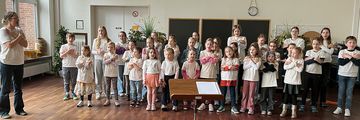 Zum Schluss sangen alle gemeinsam ein „Quodlibet“, bei dem gleichzeitig die drei Lieder „Ich lieb den Frühling“, „Zwei kleine Wölfe“ und „Frösche in der Nacht“ gesungen wurden, die trotzdem zusammenpassen.