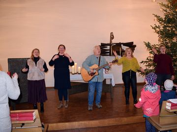 Das Westerkappelner Projekt ist in der Evangelischen Kirche von Westfalen (EKvW) das einzige, das ausgezeichnet wurde. Wie lebendig das Projekt ist, zeigte sich am 17. Dezember in der vollbesetzten, weihnachtlich geschmückten Ev. Kirche Hambüren. Im Rahmen des Lebendigen Adventskalenders hatten das Ev. Familienzentrum und die Kirchengemeinde Westerkappeln eingeladen. Kinder, Eltern und Großeltern waren mit Begeisterung dabei, als das Team und Pfarrer Olaf Maeder (Gitarre) die Gäste mit dem Lied „Kommt alle her“ begrüßte. Die Strumpfpuppen Hugo und Katrinchen fragten sich, ob ihr Kleid zu Weihnachten das richtige Outfit sei. Um sich Zeit zu sparen, warfen sie die Weihnachtsdekoration einfach auf den Tannenbaum. Die Kinder in der Kirche verfolgten die Szene gespannt. Mit lustigen Mitmachliedern ging es weiter. Das Publikum sang und klatschte begeistert mit. Weihnachtsstimmung kam mit der Geschichte auf, die Franziska Strübbe erzählte. Sie handelt von Moritz, der dem Weihnachtsengel Elias einen Wunschzettel schickt, weil das Jesuskind in der Krippe zu Hause verschwunden ist. Abschließend bedankte sich Franziska Strübbe, die Leiterin der Initiative, für die freundschaftliche Unterstützung und rief zu Spenden für das Regenbogenland des Familienzentrums Westerkappeln auf. Bei Punsch, Glühwein und Plätzchen und fröhlichem Austausch klang der adventliche Abend aus.